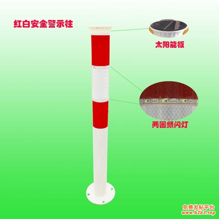 发光部分是通过两圈led交通灯带360°无死角主动发光警示灯,由太阳能光伏板补充电能,达到白天充电晚上主动发光警示效果突出,不论在白天或黑夜均有良好的警示效果。尤其是晚上,能够发挥如同白天一样的高能见度。使用这种太阳能发光警示桩,无论是白天还是晚上驾乘人员/行人是远近防撞警示柱主动发光或折射光干扰的情况下,都可以比较容易地被驾乘者和行人发现。