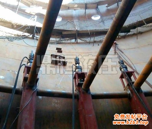 YB-60型液压泵站提升原理利用液压提升装置(成套设备)均布于储罐内壁圆周处,先提升罐顶及罐体的上层(层)壁板,然后逐层组焊罐体的壁板。采用自锁式液压千斤顶和提升架、提升杆组成的液压提升机,当液压千斤顶进油时,通过其上卡头卡紧并举起提升杆和胀圈,从而带动罐体(包括罐顶)向上提升;当千斤顶回油时,其上卡头随活塞杆回程,此时其下卡头自动卡紧提升杆不会下滑,千斤顶如此反复运动使提升杆带着罐体不断上升,直到预定的高度(空出下一层板的高度)。当下一层壁板对接组焊后,打开液压千斤顶的上、下松卡装置,松开上下卡头将提升杆以及胀圈下降到下一层壁板下部胀紧、焊好传力筋板,再进行提升。如此反复,使已组焊好的罐体上升,直到后一层壁板组焊完成,从而将整个储罐安装完哔。